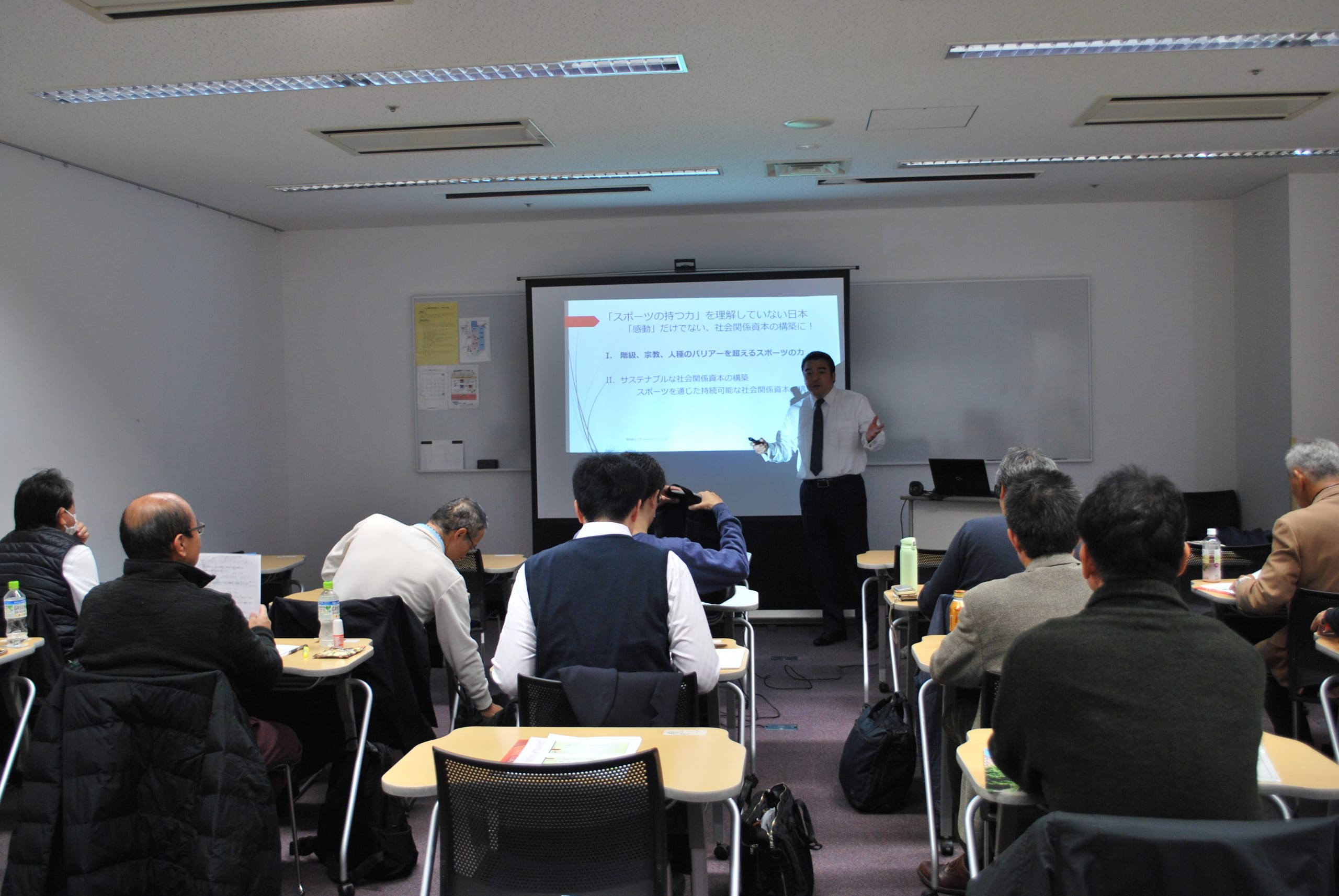 | 内 容 | ラグビーワールドカップを例に「スポーツの持つ力」について解説しました。スポーツを通じて蓄積された社会関係資本は人種、階級、宗教などの高い障壁を超える力があることを理解し、静岡における新たな社会関係資本構築について論及しました。 |