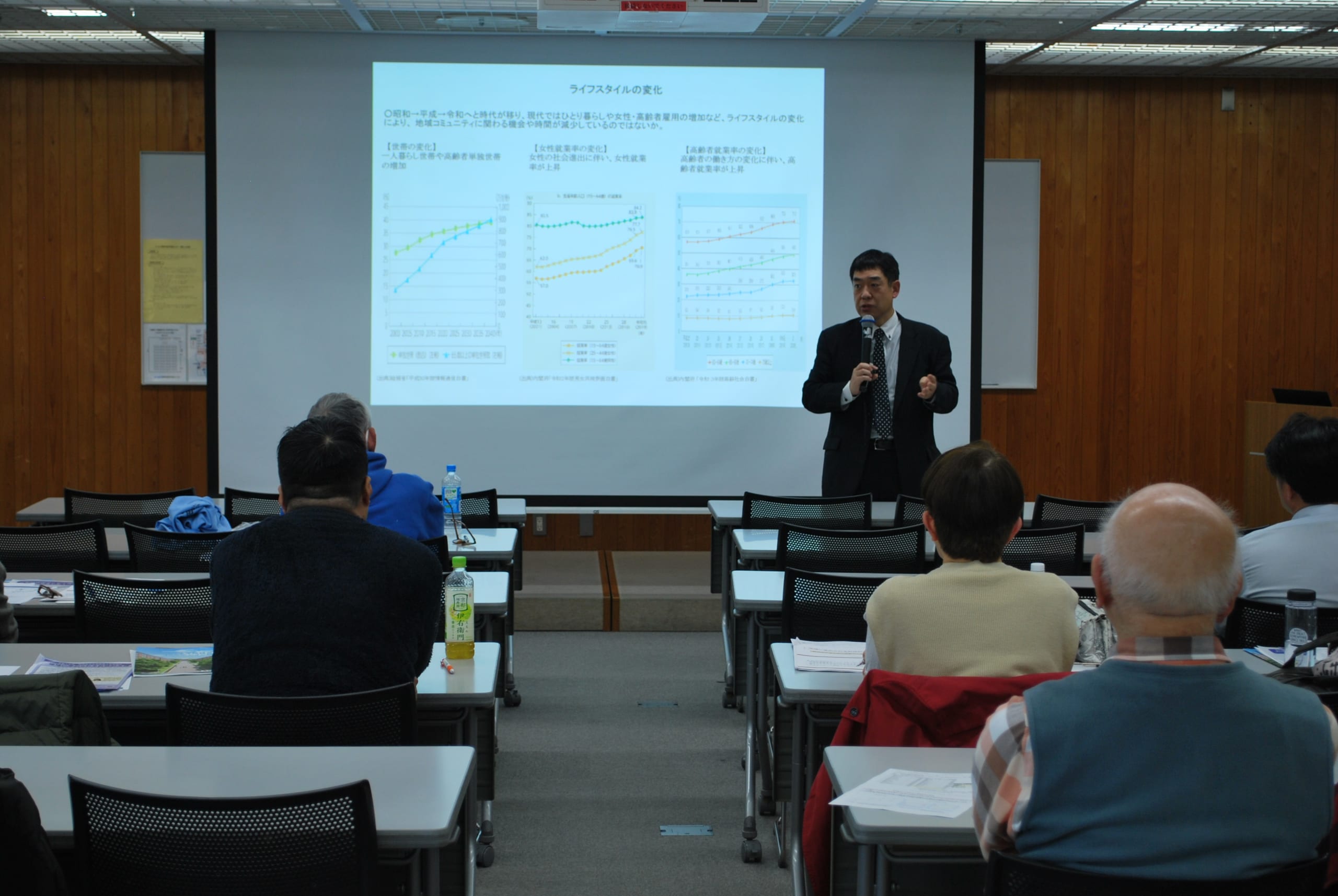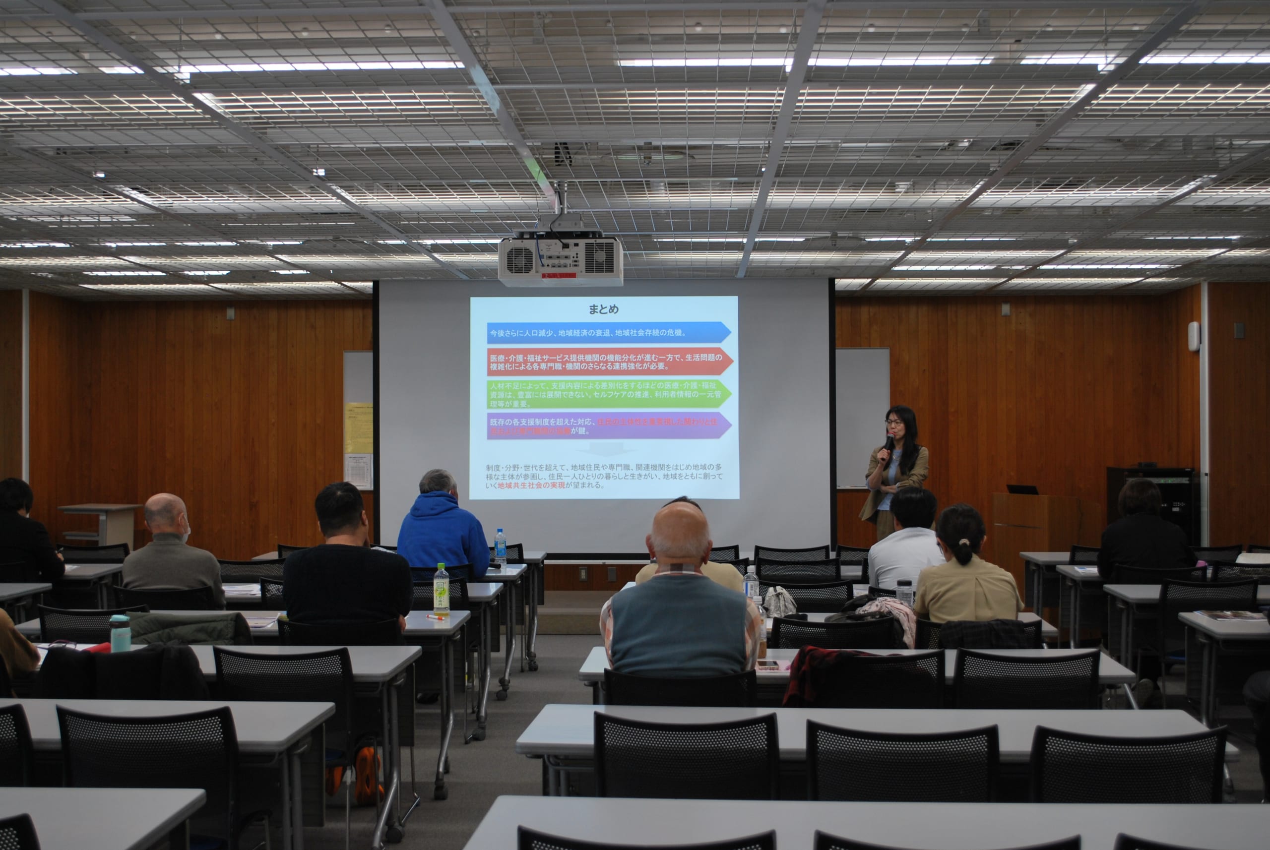 内 容 地域共生社会の実現に向けた現状と課題について解説し、2040年を展望した様々な分野の連携と協働の推進について考えました。今後、医療・福祉体制を持続的に維持していくためには、制度・分野・世代の枠を超えて、地域住民・専門職・行政機関・企業など、多様な主体が協働することが不可欠であることを示し、特に住民主体の取組みや、企業を巻き込んだ活動、誰もが楽しみながら関われる仕組みづくりなど、行政・地域・企業が連携しながら地域の仕組みを再設計していく必要性があると述べました。講義の後には、質疑応答や参加者との意見交換を行いました。